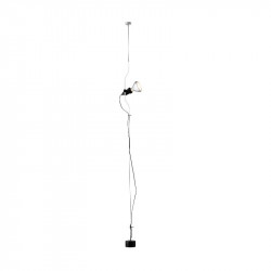 Lampada a luce diretta. Il movimento verticale del corpo illuminante ottenuto mediante lo scorrimento di un tubolare di acciaio sagomato, verniciato a liquido o nichelato, su un cavetto di acciaio teso tra il plafone e pavimento (lunghezza utile mm 4000). Testa dell'apparecchio in elastomero stampato ad iniezione di colore nero all'interno della quale...