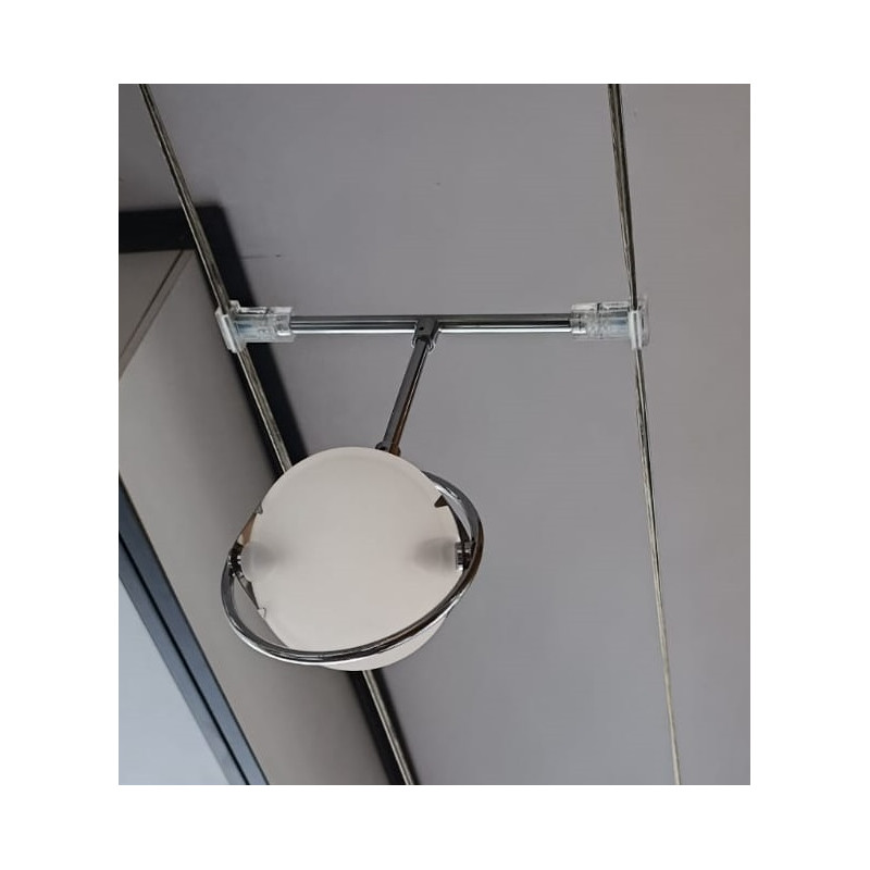 lampada a sospensione su cavi paralleli con montatura in metallo cromato lucido ,fornita con due diffusori in vetro stampato acidato