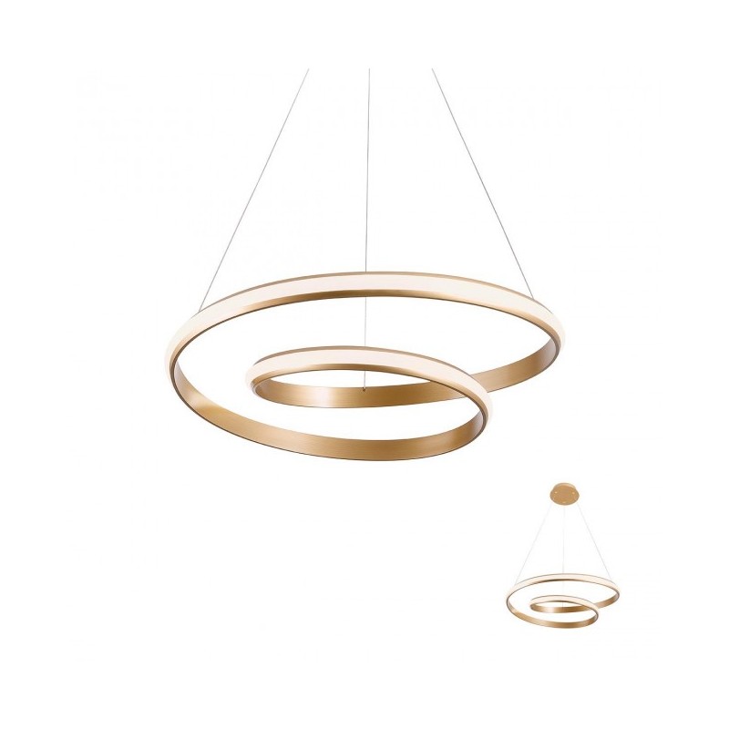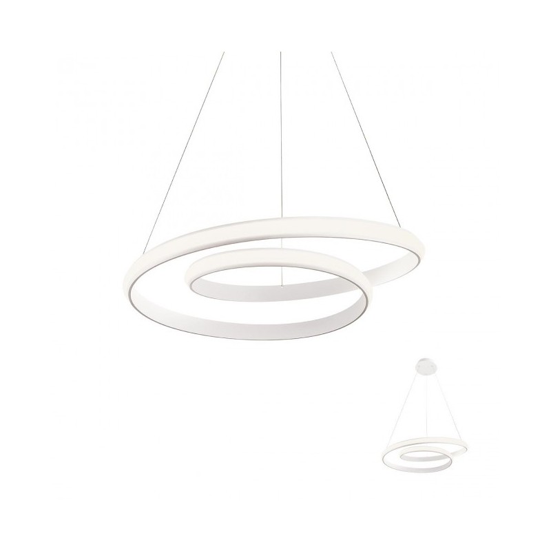 lampada da sospensione per interni, equipaggiati con SMD LED, con possibilità di selezionare la temperatura colore della luce, struttura in alluminio e metallo verniciata a polveri bianco opaco, oro opaco o nero opaco, diffusore in silicone opalino bianco. Sorgente luminosa a led 40W, 3779 lumen.