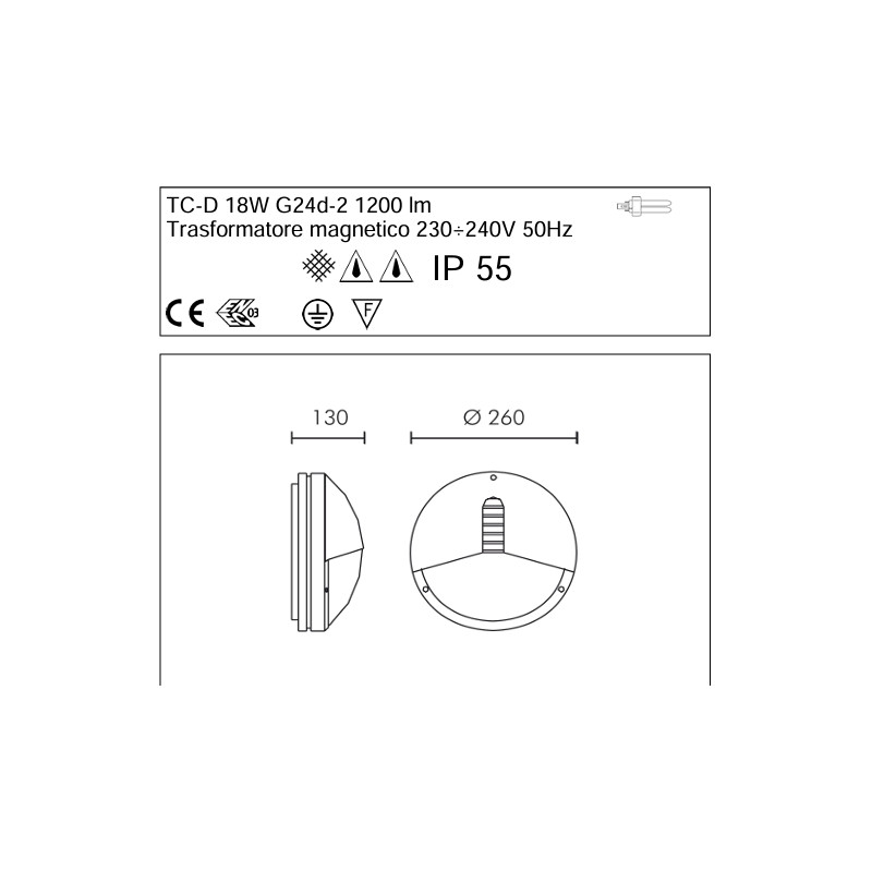 lampada da parete o soffitto per esterno IP55 con corpo in pressofusione di alluminio ad elevata resistenza all'ossidazione e diffusore in vetro. Sorgente luminosa fluorescente a basso consumo 18W G24d2 compresa. N.B VIENE FORNITA COMPLETA DI LAMPADINA